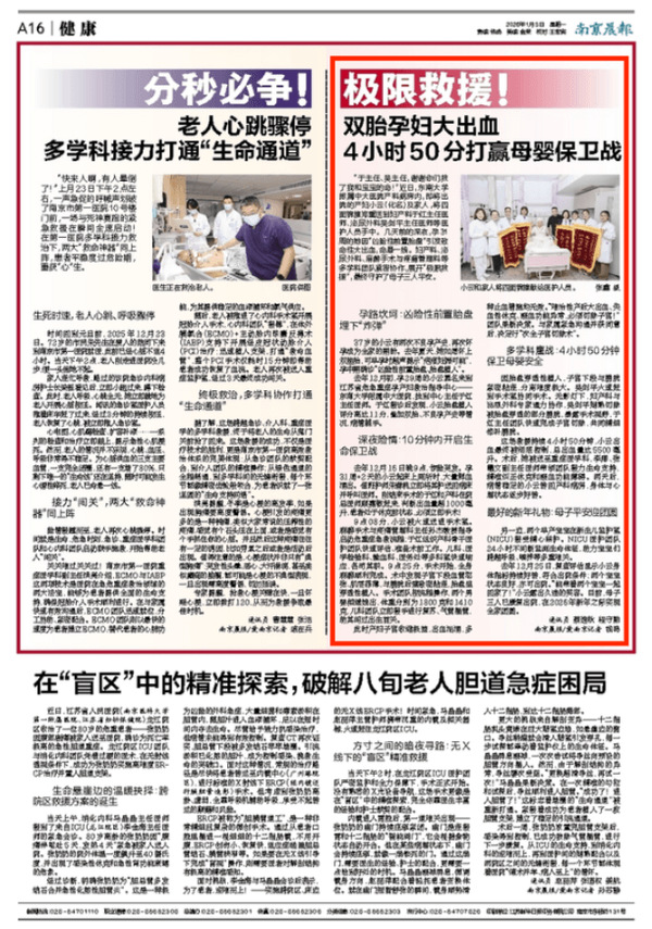 孕路坎坷:凶险性前置胎盘埋下“炸弹” 37岁的小云有两次不良孕产史,再次怀孕成为全家的期盼。去年夏天,她如愿怀上双胞胎,可早孕时超声提示“疤痕妊娠可能”,孕中期确诊“凶险性前置胎盘、胎盘植入”。 去年12月初,孕29周的小云慕名来到江苏省危急重症孕产妇救治指导中心——东南大学附属中大医院,找到中心主任于红主任医师。于红接诊后发现,小云胎盘植入评分高达11分,叠加双胎、不良孕产史等情况,病情棘手。 深夜险情:10分钟内开启生命保卫战 去年12月16日晚9点,惊险突发。孕31周+2天的小云起床上厕所时,大量鲜血涌出。值班护师朱春桃立即将其护送回病床并呼叫医师。刚结束手术的于红和产科住院总医师顾嘉敏赶来,判断出血量超1000毫升,患者处于休克前状态,必须立即手术! 9点08分,小云被火速送进手术室。麻醉手术与疼痛管理科主任孙杰教授指导启动危重症急救流程;于红组织产科骨干医护团队快速评估、准备术前工作。儿科、医学检验科、输血科、医务处等多科室快速响应,各司其职。9点25分,手术开始,全身麻醉顺利完成。术中发现子宫下段血管怒张、肌层菲薄,与膀胱后壁致密粘连,胎盘呈穿透性植入。手术团队按流程操作,两个男婴相继娩出,体重分别为1800克和1410克,儿科团队立即接手进行复苏、气管插管,助其闯过出生首关。 此时产妇子宫收缩极差,出血汹涌,多种止血措施均无效。“难治性产后大出血、失血性休克、凝血功能异常,必须切除子宫!”团队果断决策。与家属紧急沟通并获同意后,决定行“次全子宫切除术”。 多学科鏖战:4小时50分钟保卫母婴安全 因胎盘穿透性植入,子宫下段与膀胱紧密粘连,分离难度极大。吴剑平火速赶到手术室协同手术。无影灯下,妇产科与泌尿外科专家通力协作,吴剑平娴熟切除被胎盘穿透的部分膀胱,暴露手术视野,于红主任团队快速完成子宫切除,共同精细修补膀胱。 这场救援持续4小时50分钟,小云出血最终被彻底控制,总出血量达5500毫升。术后,她被送至重症医学科,李卿、张曦文副主任医师带领团队接力生命支持,精准纠正休克和凝血功能障碍。两天后,病情稳定的小云转回产科病房,身体与心理状态逐步好转。 最好的新年礼物:母子平安迎团圆 另一边,两个早产宝宝在新生儿监护室(NICU)接受精心照护。NICU医护团队24小时不间断监测生命体征,助力宝宝们跨越呼吸、喂养等多重难关。 去年12月25日,复查评估显示小云身体指标持续好转,符合出院条件;两个宝宝状态良好,亦可出院。“能带着两个宝宝一起回家了!”小云露出久违的笑容。目前,母子三人已康复出院,在2026年新年之际实现全家团圆。 通讯员 蔡逸秋 程守勤 南京晨报/爱南京记者 钱鸣