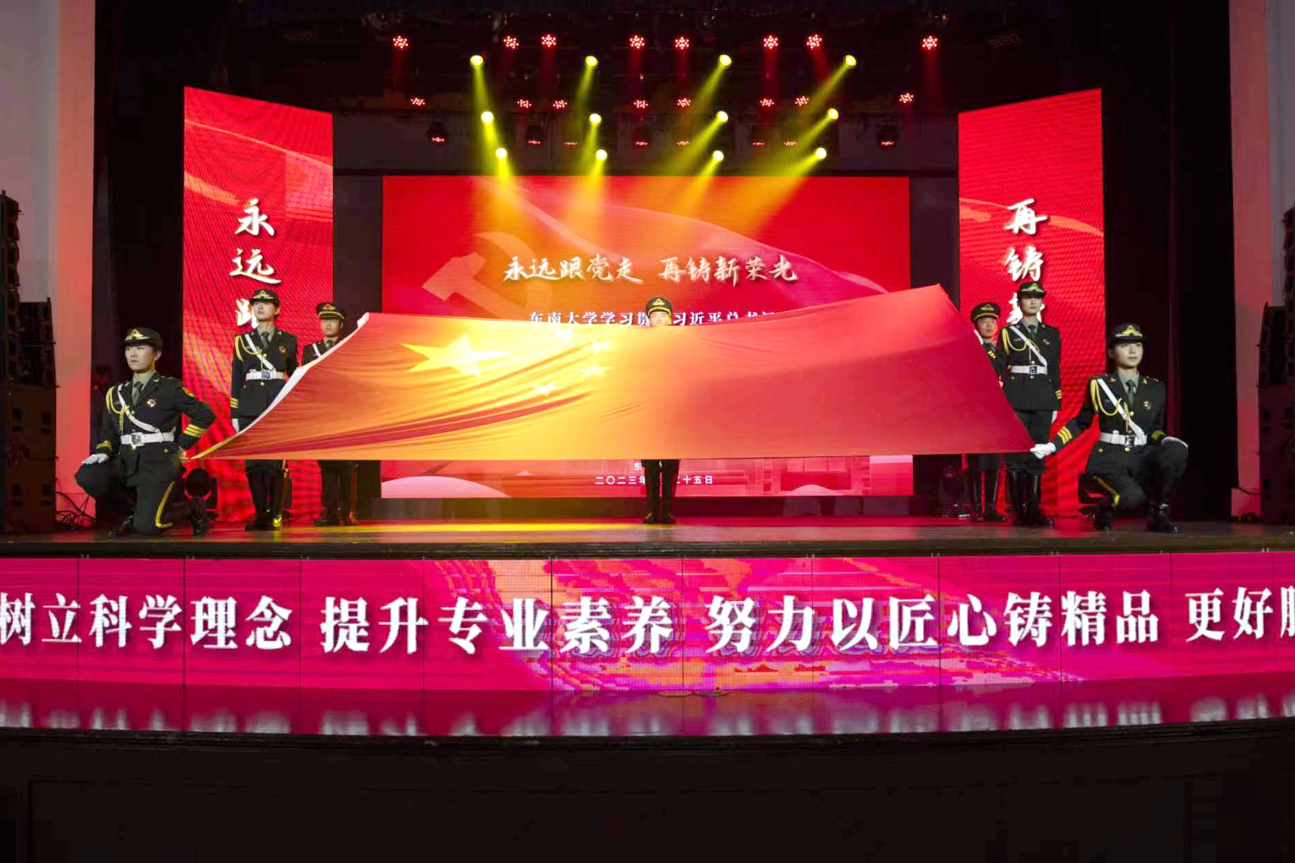 活动在嘹亮的国歌声中拉开序幕。与会人员共同观看了青年献词《永远跟党走,奋斗正青春》、原创合唱《初心照梅庵》、青春思辨会、东南大学百名青年首都行主题团日活动回顾视频、国旗交接仪式、东南大学“团二大”研究中心揭牌,及中国社会主义青年团第二次全国代表大会史料展线上展厅发布仪式。