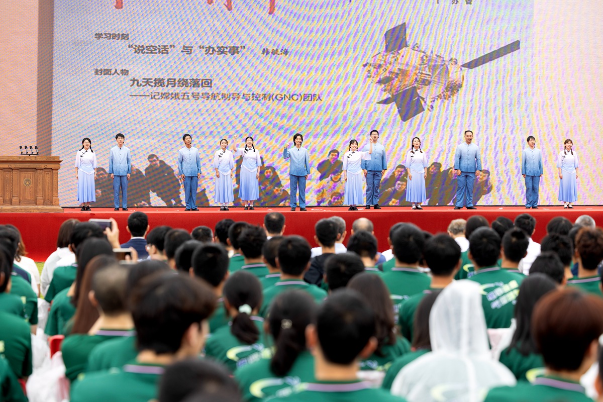 首先登台的是9位学生代表,他们中有2023级新生代表计算机科学与工程学院、软件学院、人工智能学院本科生舒展,吴健雄学院本科生肖映天,材料科学与工程学院博士生徐潇航,网络空间安全学院硕士生雷镇宇,艺术学院本科留学生荷亚;在校生代表本科生建筑学院王小瑜、经济管理学院龙璇,博士生机械工程学院任彦君、信息科学与工程学院曹阳,他们以“东大我想对你说”为题,分享了各自的追梦故事,引起了现场学生的阵阵共鸣。