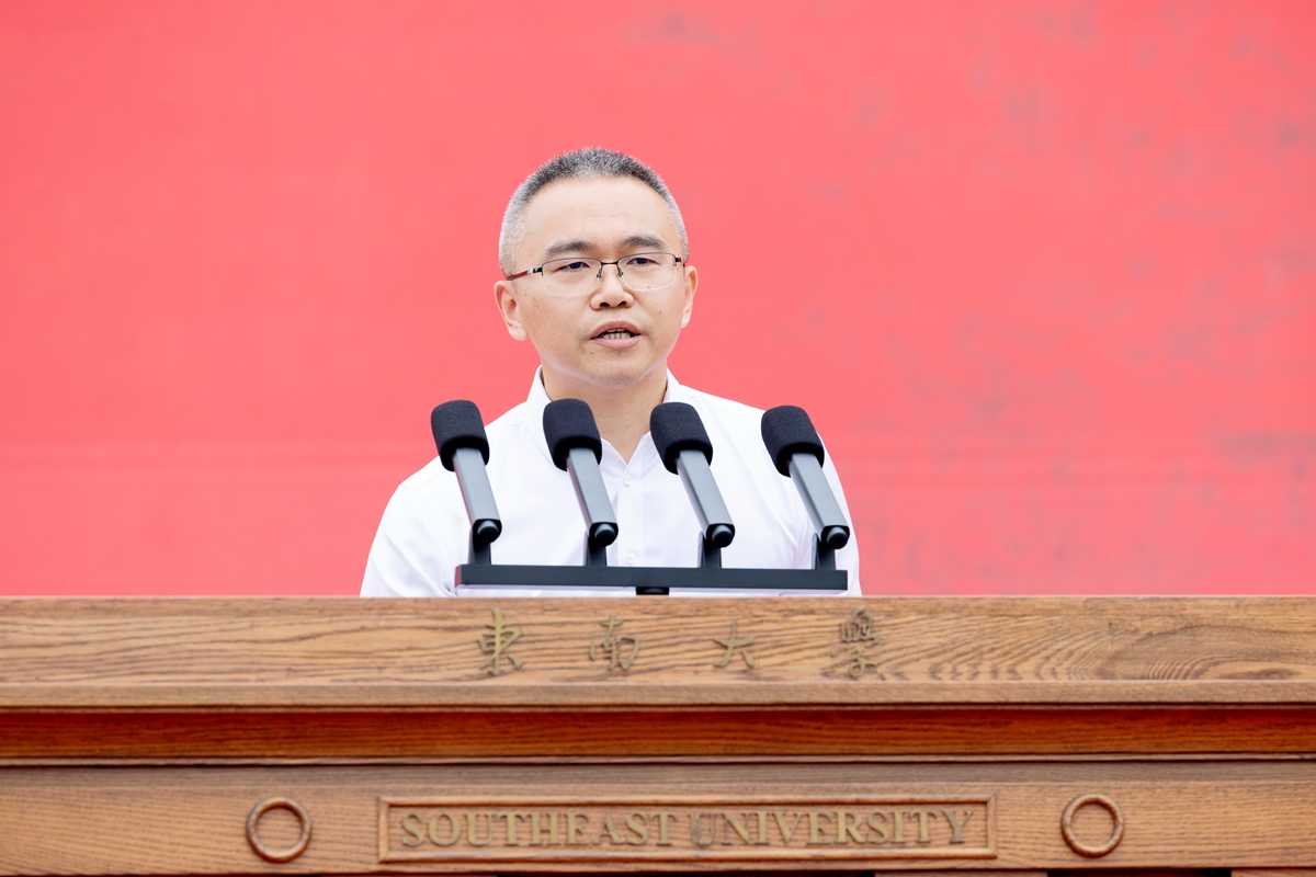 东南大学1994级校友、上海概伦电子股份有限公司董事兼总裁杨廉峰作为校友代表发言。他深情回顾了自己求学东大、见证科技高速发展的历程,并就如何把握时代机遇,与同学们分享了三点感悟:一是要理论结合实践,寻找个人的兴趣点和兴奋点;二是要主动沟通,坦然面对失败;三是要保持专注,以坚持创造时代价值。他希望东大人胸怀“国之大者”,追求卓越,勇毅前行,以技术创新,争当伟大理想的“追梦人”。