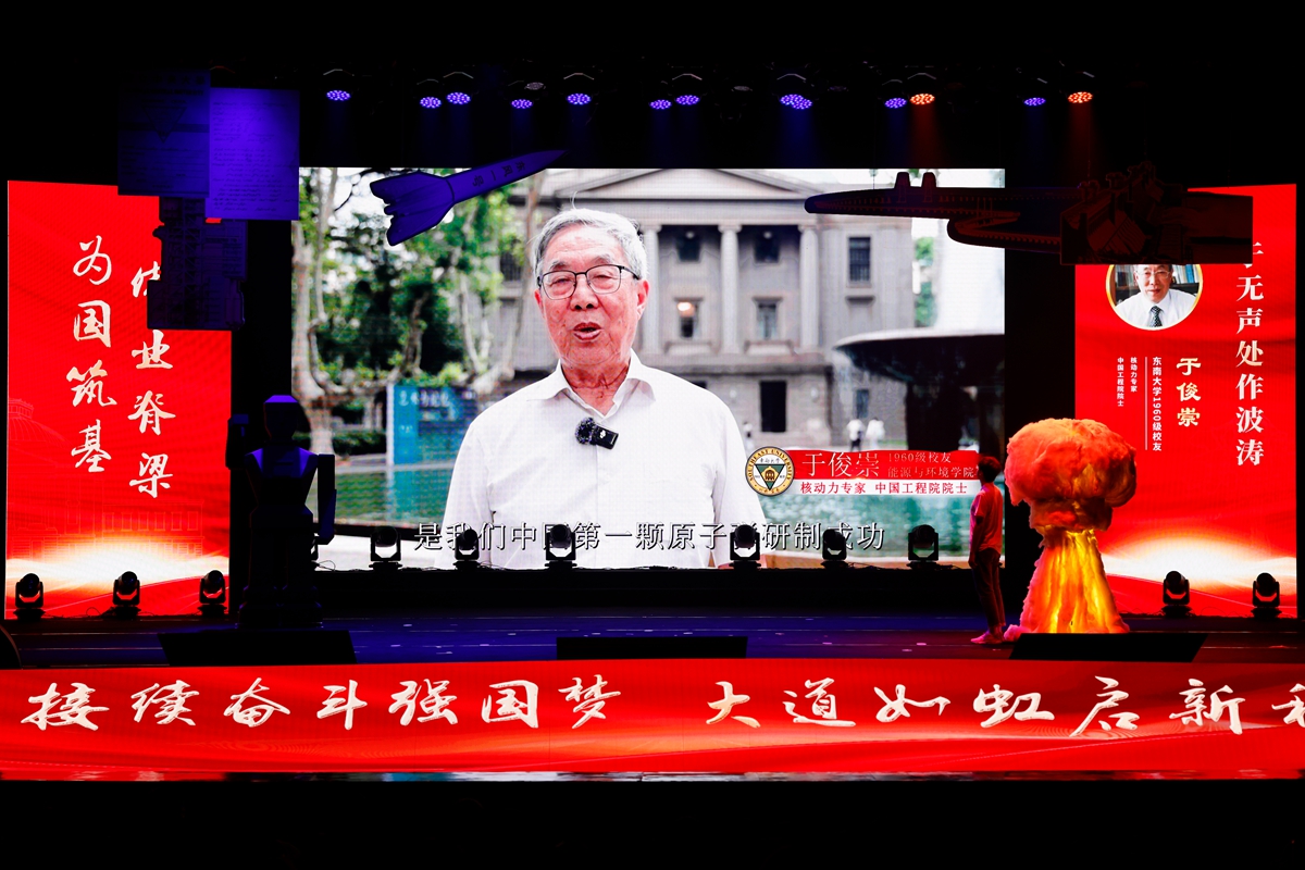 第二篇章“为国筑基 伟业脊梁”通过现场与视频相结合的方式,向师生们动情讲述了一代代东大人如何垒石成峰、接续奋斗,用智慧和汗水铸就兴国伟业的坚实脊梁。现场以《将这血肉“补”在导弹上》《于无声处作波涛》《机器人的启航与教育之光》《做脊梁的支撑者》为题,讲述了从“两弹一星”功勋奖章获得者、中国科学院院士、东南大学校友黄纬禄,到中国工程院院士、核动力专家、东南大学校友于俊崇;从新中国第一台人形机器人研制者查礼冠教授的先驱探索,到黄惟一教授的深耕细作,再到宋爱国教授的领航创新;以及孙伟、缪昌文、刘加平三位院士接力前行,为三峡工程、港珠澳大桥等大国重器保驾护航的传承故事。
