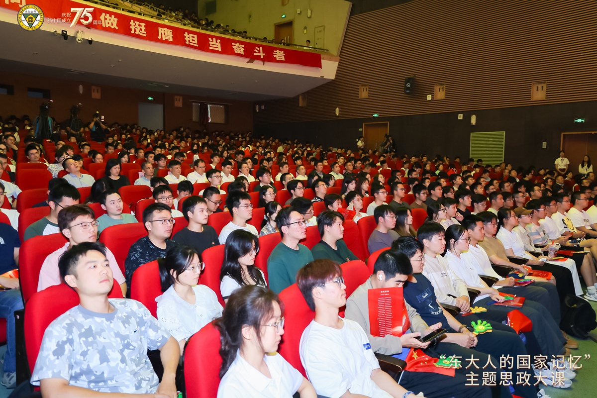 主题思政课在庄严的《中华人民共和国国歌》声中拉开帷幕。全体师生首先观看了“课程序章”——《千重山水千重歌 万里家国万里志》视频短片,回顾了新中国成立75周年以来,东大人深刻而感人的国家记忆。